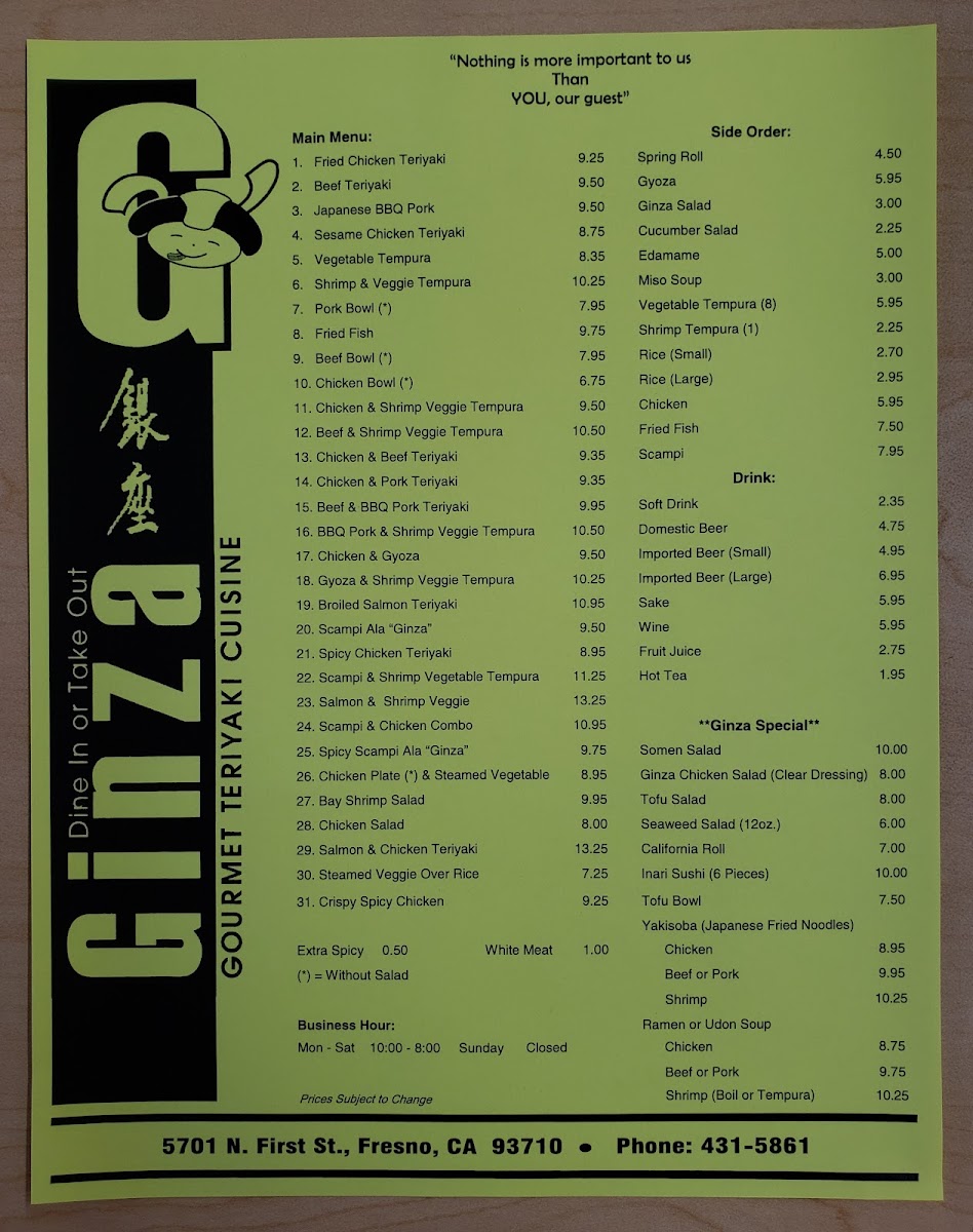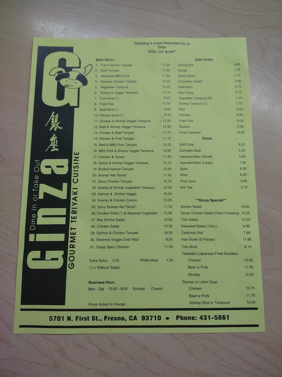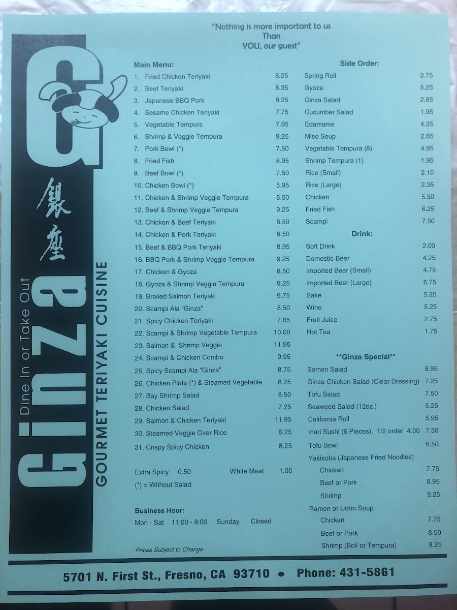 Ginza Gourmet Teriyaki House Menu